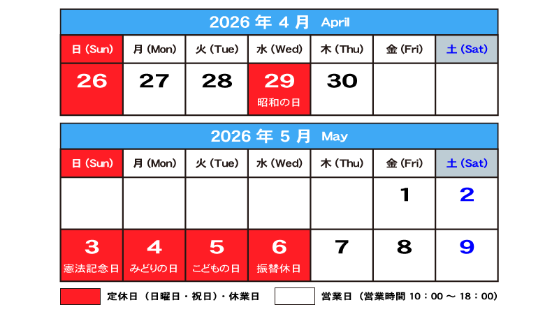 GW休業日:4月29日(水)5月3日(日)~5月6日(水)