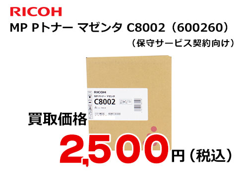 ただいま高価買取中! ※表示の価格は、2024年1月8日 現在のものです。 ※買取価格は、商品の状態や市場動向によって変わる場合があります。 最新の買取価格は、下記「無料見積もり依頼」よりお問い合わせ下さい。 リコー(RICOH) デジタルフルカラー複合機 純正トナー RICOH MP Pトナー マゼンタ C8002(600260)※保守契約供給品 カラー マゼンタ 印刷枚数 約29000枚 対応機種 RICOH MP C8002/C6502シリーズ